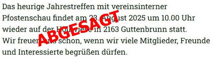Das heurige Jahrestreffen mit vereinsinterner Pfostenschau findet am 26. August 2023 ab 10.00 Uhr wieder auf der Höllwiese in 2163 Guttenbrunn statt.